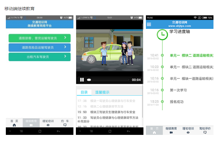 包含旅客、货物、危险品、出租车驾驶员、教练员从业资格培训和远程继续教育。手机与电脑同步计算学时情况,听课时长自动累计。