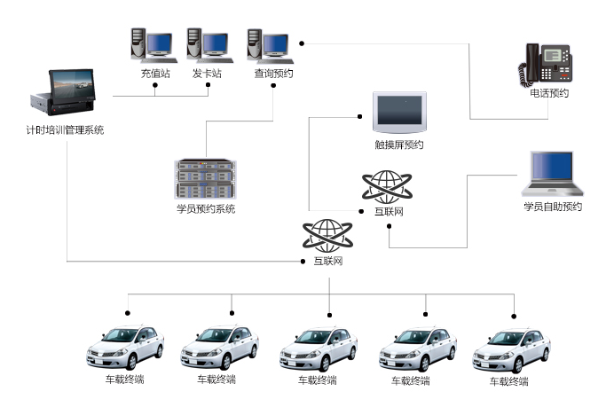 该系统包含:预约管理、培训管理、计时收费三部分组成。预约管理实现学员网上约车, 账户信息查询,预约记录查询,预约密码修改,对教练进行评价等功能;培训管理主要用来管理学员、教练培训记录、学员教学日志及进度;计时收费采用车载终端控制车辆,记录车辆轨迹, 使用IC卡实现学员身份识别及计时收费等。